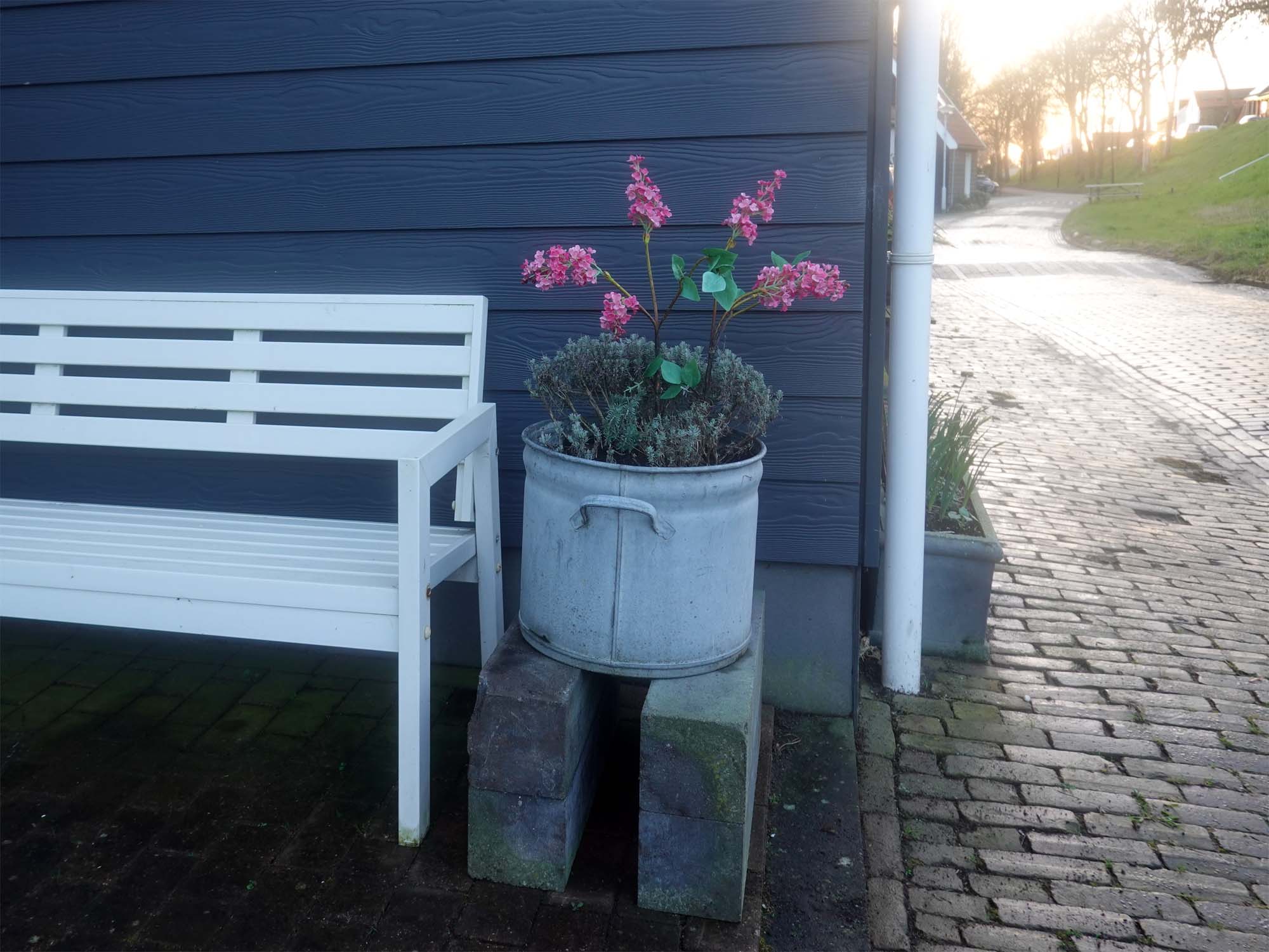 Wat was het weer een heerlijke dag! Na het ochtenrondje verder waar ik gisteren gebleven was. Stoelen uit de hoek en afgespoten, gootje schoongemaakt, geschuurd waar het kon, bankje mosvrij gemaakt, de paal waar de wasketel op staat omgelegd, zodat de wasketel er helemaal op past. Ramen gezeemd, vlag opgehangen want morgen hebben we feest.