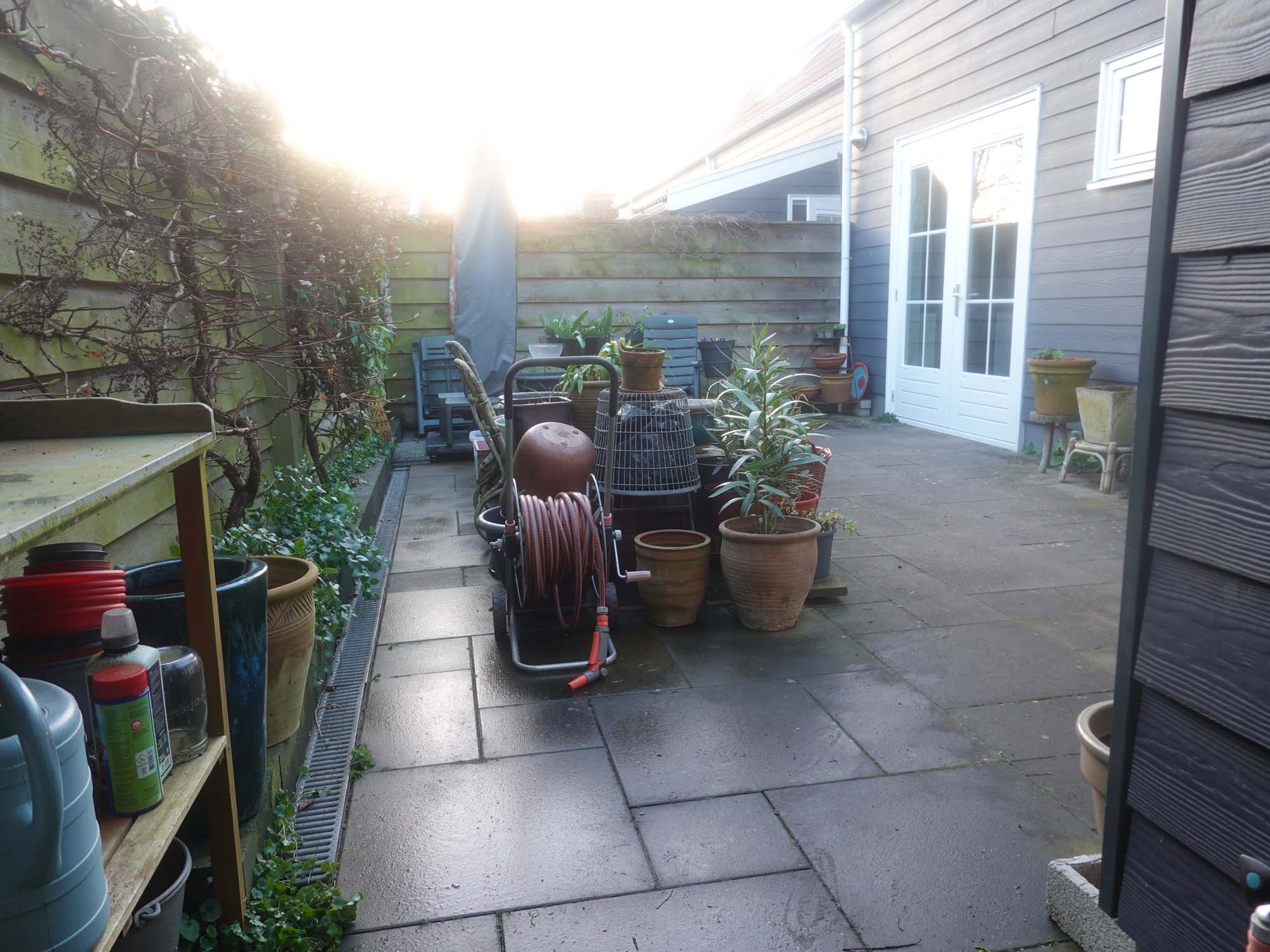 De Japanse jasmijn flink gekortwiekt, die was twee keer zo dik, af en toe moet het even, de klimhortensia daardachter moet na de bloei ook, die zit nu vol knoppen.