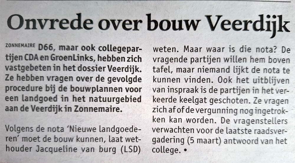 De nota 'nieuwe landgoederen' is kwijt, niemand weet waar de nota is, en deze is toch best belangrijk denk ik, want het moet toch ergens staan dat het mag, die bouw aan de Veerdijk en dat staat dan dus in die nota, die kwijt is. Misschien zijn ze vergeten hem te maken, 'we keuren het gewoon goed, die nota komt later wel'...