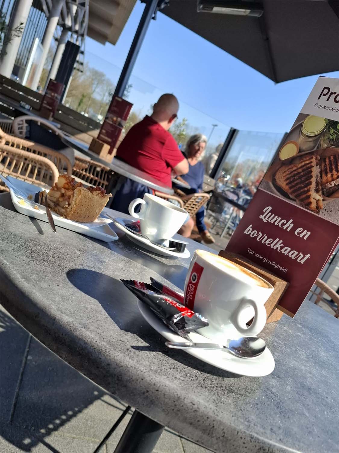 Een pleintje met een paar flinke winkels bij elkaar. AH, de Lidl, Proost voor drank en daarbij horend een Brasserie met een terras. We gingen lekker even zitten in de zon en fietsten op het gemak? weer naar huis.