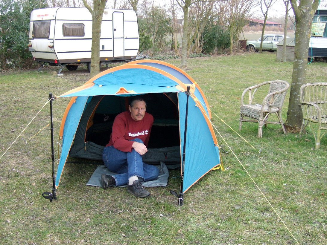 De foto is van twintig jaar geleden, Joop had een nieuw tentje waar hij erg blij mee was en dat overal mee naar toe is geweest.