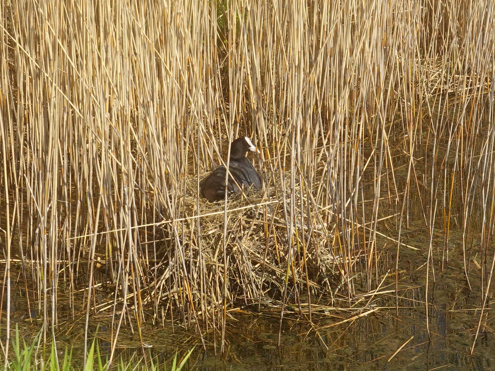 Op de plek waar het meerkoetje elk jaar zit te broeden stopten we even en jawel, daar zat ze alweer, nu aan de andere kant van de vaart, het is niet echt een sloot. Ze had een keurig, heel hoog nest gemaakt en ze bleef netjes zitten... 'oh dat is zij weer, met die zwarte jas', zal ze gedacht hebben. Ik ging ook niet heel dichtbij .