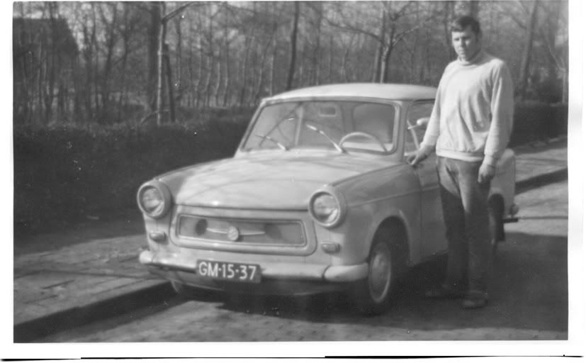 De eerste een "echte" Trabant gekocht in febr.1969, prachtig turquoise blauw. Daar botste Joop eens mee tegen een boom, toen zat er een gat in, dat hebben we gerepareerd, maar later gebeurde er iets onherstelbaars mee, ik weet niet goed meer wat.
