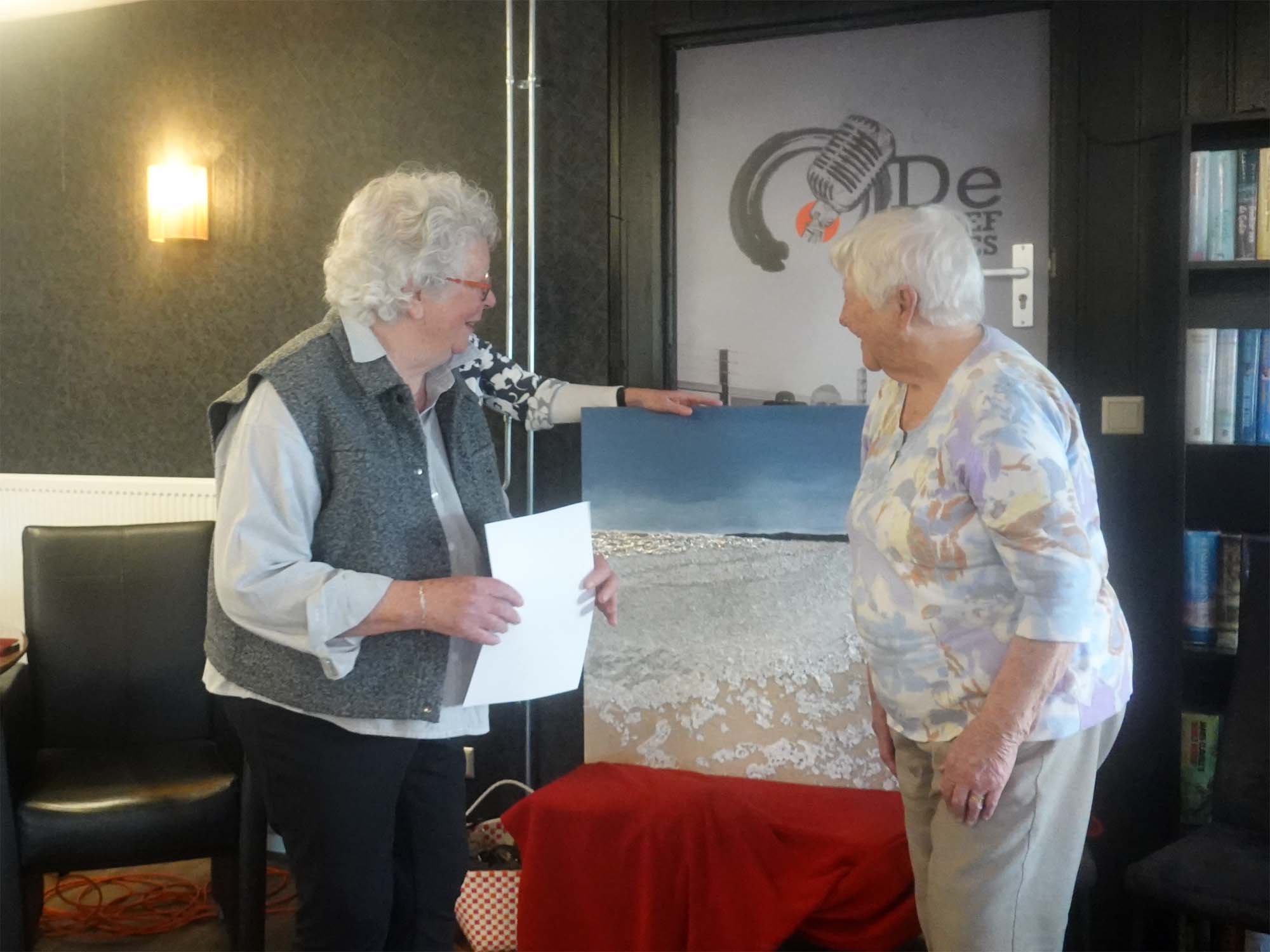 In het oogcafé was tot mijn verrassing schoolvriendin Marian Gaanderse om wat van haar schilderijen te laten zien, met bjbehorende gedichten, ik had het hier al eerder over haar..