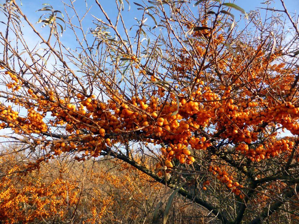Bij het Koepeltje dat zelf zo langzamerhad aardig in de bosjes verdwijnt, kleurt de boel oranje door de besjes van de Duindoorn