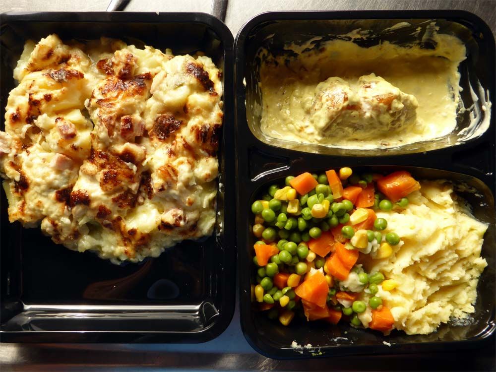 Vanavond werd onze gisteren bestelde maaltijd van DailyKeet bezorgd, ik dacht dat ik er wel eentje zou moeten betalen, maar kreeg ze allebei gratis. Joop at een stukje zeewolf met aardappelpuree en doperwtjes, mais en worteltjes en ik een stuk prei-ham-kaas-aardappeltaart. Lekker en lekker makkelijk natuurlijk!