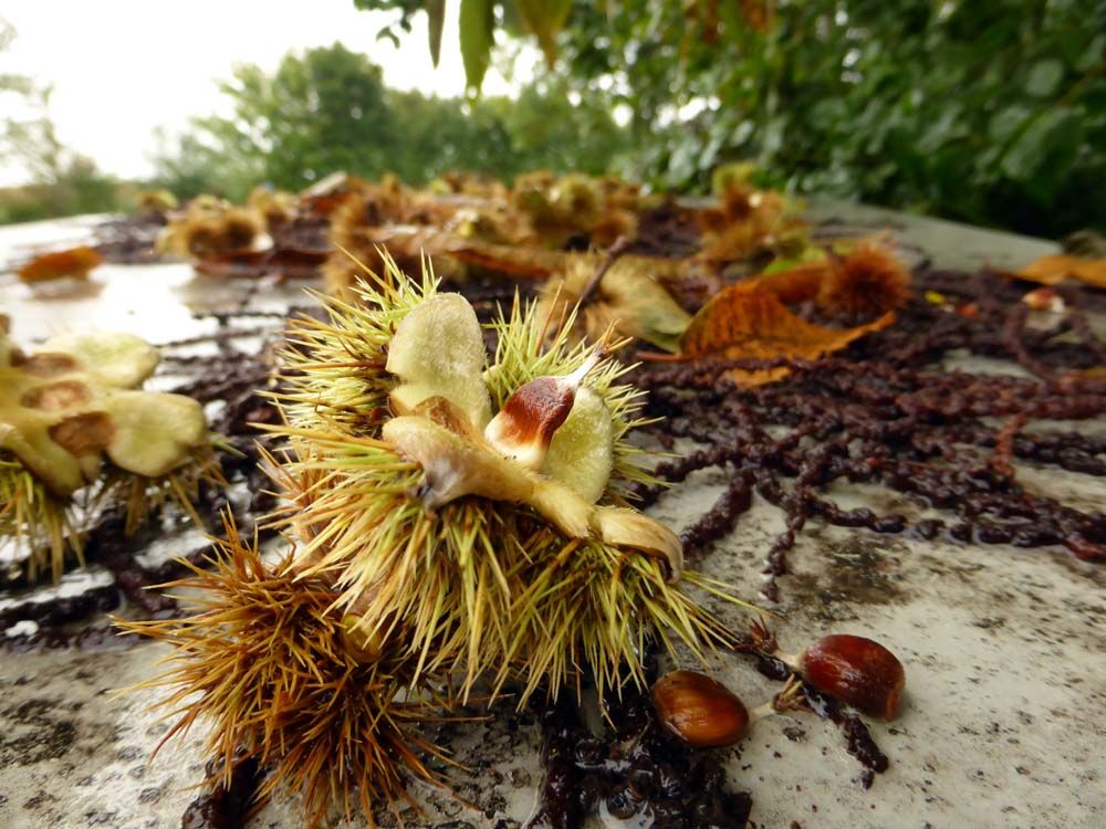 Ik vond ook wilde tamme kastanjes, tenminste ik denk dat ze dat zijn, al mochten ze bijna de naam kastanje niet dragen hoor, zulke ieniemienie dingetjes waren het, de moeite van het pellen niet waard, dat heb ik dan ook niet gedaan.