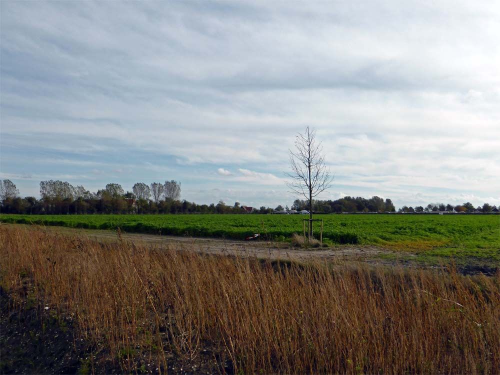 Zodoende kwamen we ook langs de eerste Schouwse koningslinde, afgelopen maart geplant. Hoe ze er nu bij komen dat die halfverwege het ommetje van Ellemeet staat is natuurlijk onzin, want de enige weg die er langslooopt is die verdeelweg, die nog lang en breed niet klaar is.
