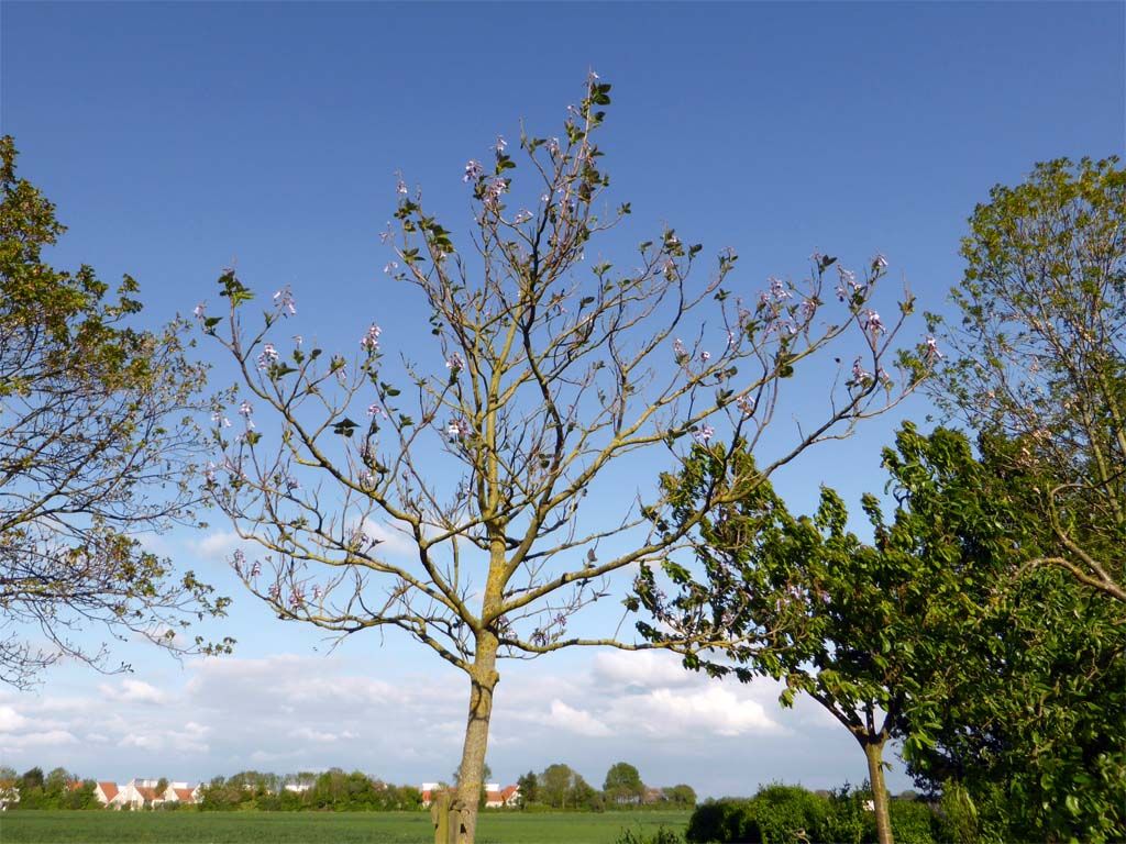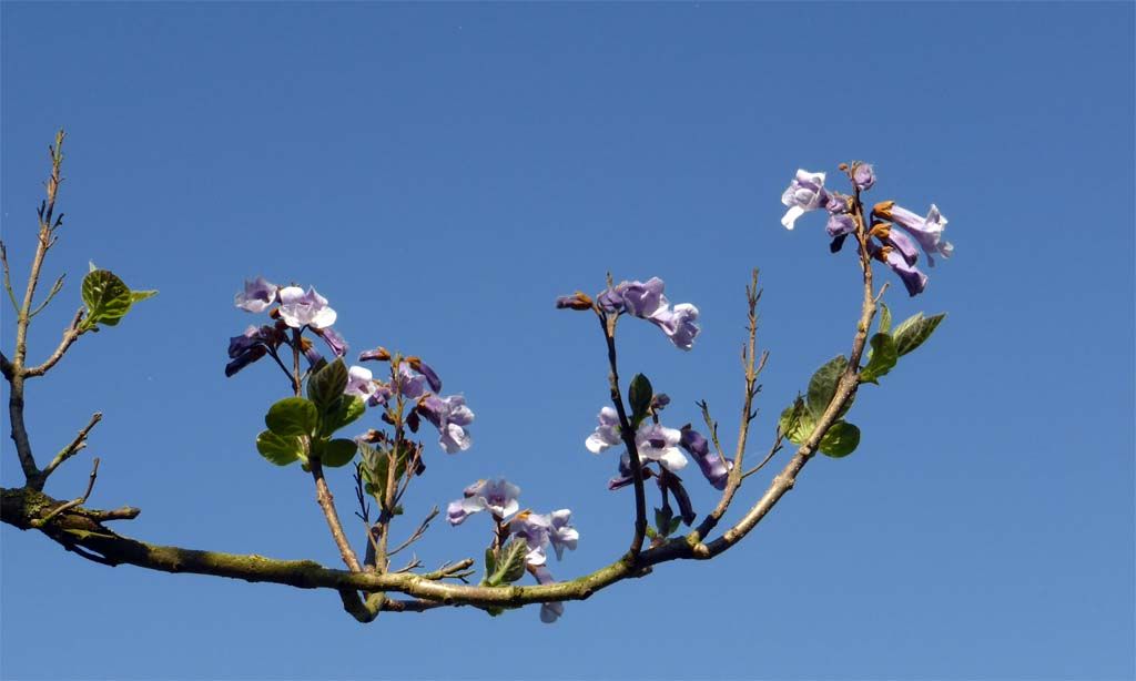 De Pauwlonia Tomentosa bloeit, maar als ik de afbeeldingen op het net bekijk, stelt die van ons niets voor en zijn het ook eigenlijk maar labiele kelkjes, de helft ligt al op het gras.
