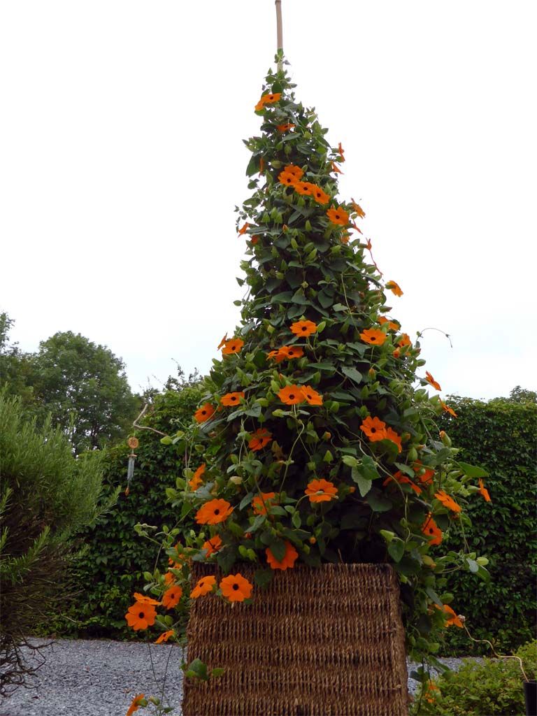 Toen ik haar kocht was ze ongeveer de helft en ik zette de standaard van de gebroken regenmeter erbij om te groeien en dat deed ze. Die standaard is inmiddels nergens meer te zien , ik heb haar nu nog maar een stok gegeven...
