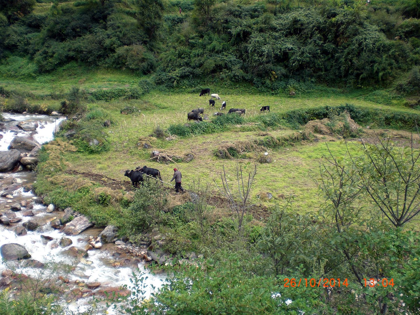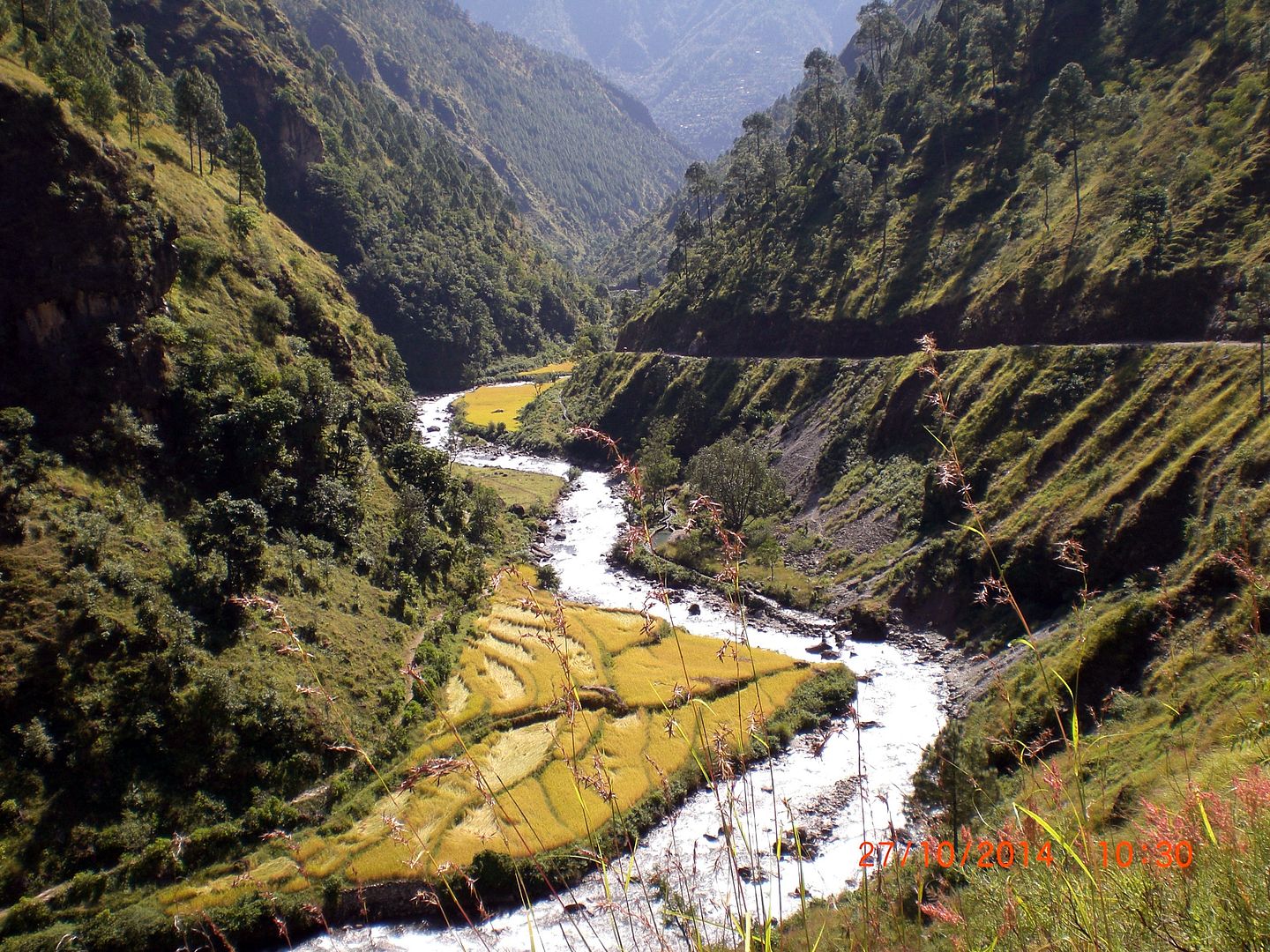 Joop: Het weer was beïnvloed door de orkaan in India. Het was kouder dan normaal. Boven de 2500 mtr vroor het 's nachts flink maar daar was ik op ingesteld. Ik ben nooit bang voor beesten. We hebben 1 keer een groot kat achtig dier gezien die aan de overkant van de rivier kort en regelmatig stond te blazen naar ons net als een kat. Het was zo groot als een linx. Ze noemden het een box dear.