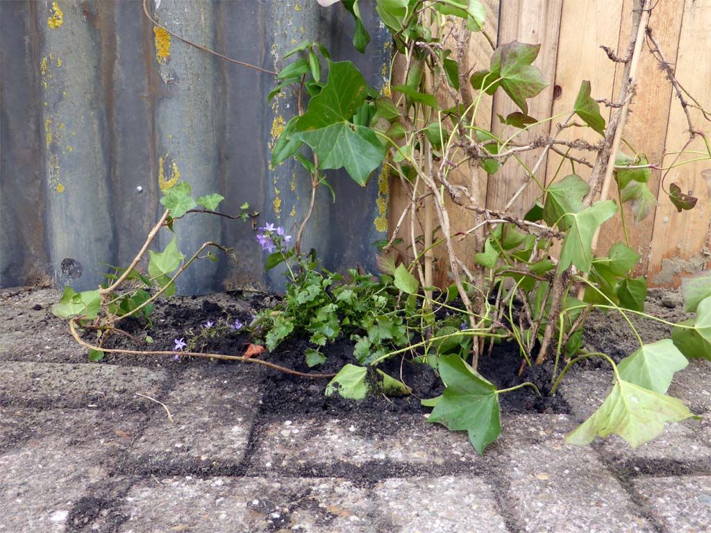 Er moest namelijk voor een gat eerst een steen uit de bestrating, op zich al een heel karwei, daarna een laag zand eruit, de tuinaarde erin, klimop erin en dan weer een beetje fatsoenlijk afwerken en dat keer acht.