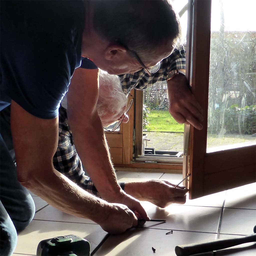 Het gebeurde al toen Joop in Nepal zat. 's Avonds laat bedacht ik dat ik vergeten was de rolemmer van de straat te halen, dus dat ging ik nog even doen. Door de tuindeur er uit en ook weer naar binnen, kruk omdraaien en 'krak'. Kapot. Er brak iets af en hij ging niet meer dicht.