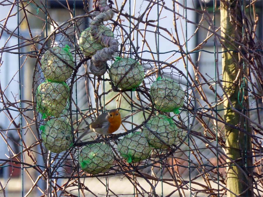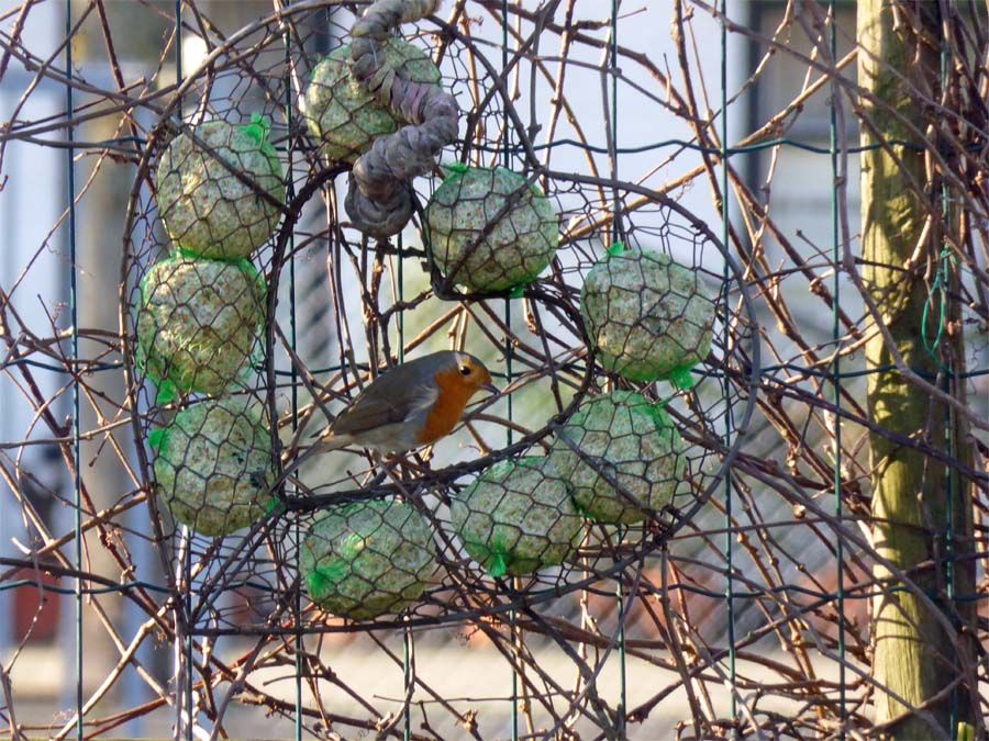 De vetbolletjes zijn niet erg in trek, ze zijn nog van vorig jaar en misschien wel een beetje muf, maar het roodborstje pikt er af en toe nog van.