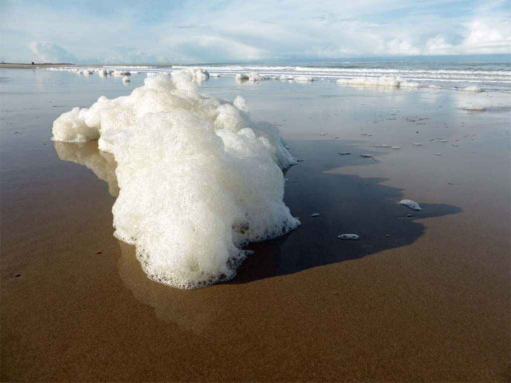Toch maar eens gezocht: “In de zee leven microscopische kleine plantjes (algen). Eén van de vele algenfamilies is Phaeocystis of schuimalg. Deze microscopische kleine plantjes vormen kolonies. Dit zijn grote hoeveelheden die bij elkaar samenklitten. Ze hechten zich in een laag gelatine. Wanneer deze kolonies afsterven, wordt de gelatine door de golven tot schuim opgeklopt. De wind en de stroming voeren dat schuim naar het strand. Het zeeschuim is dus een verzameling afgestorven algen.”