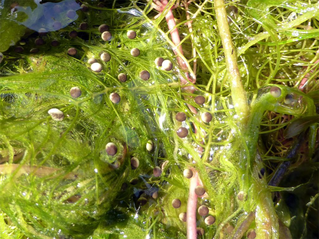 Het leken net kleine zuurstofbelletjes die mee naar boven kwam bij het alg vissen vanmorgen. Toen het eenmaal in de kruiwagen lag en ik nog eens wat beter keek zag ik dat het eitjes waren.