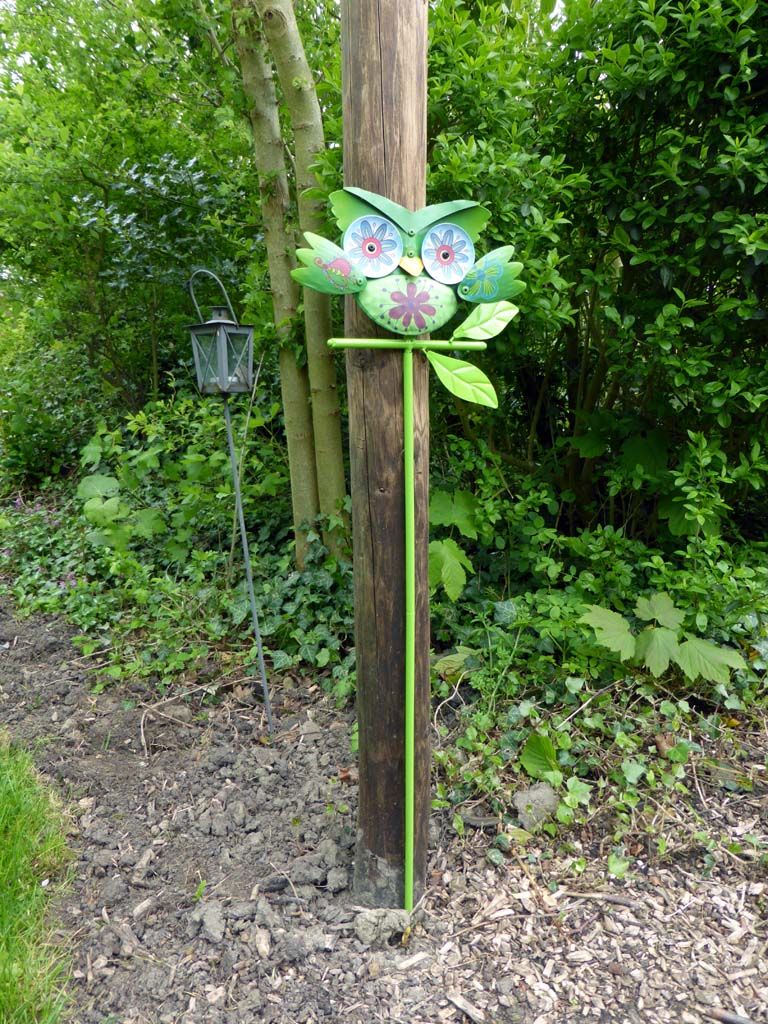 De uil fladderde wat en streek neer bij de pas gebouwde rozenboog. Zo heeft hij goed overzicht over een groot deel van de tuin en geeft tegelijkertijd de afslag aan.