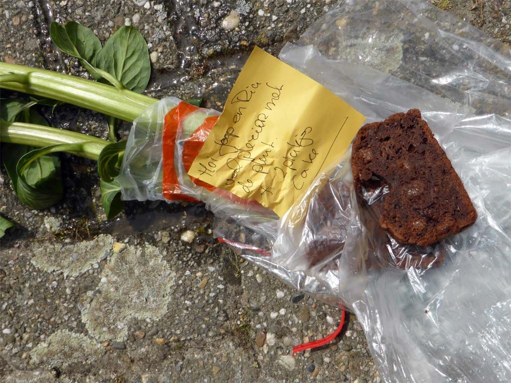 Toen ik de stek thuis uit de auto haalde zag ik dat er als verrassing twee lekkere plakjes cake bij zaten, die smaakten prima bij de koffie en daarvan wil ik ook wel een recept.
