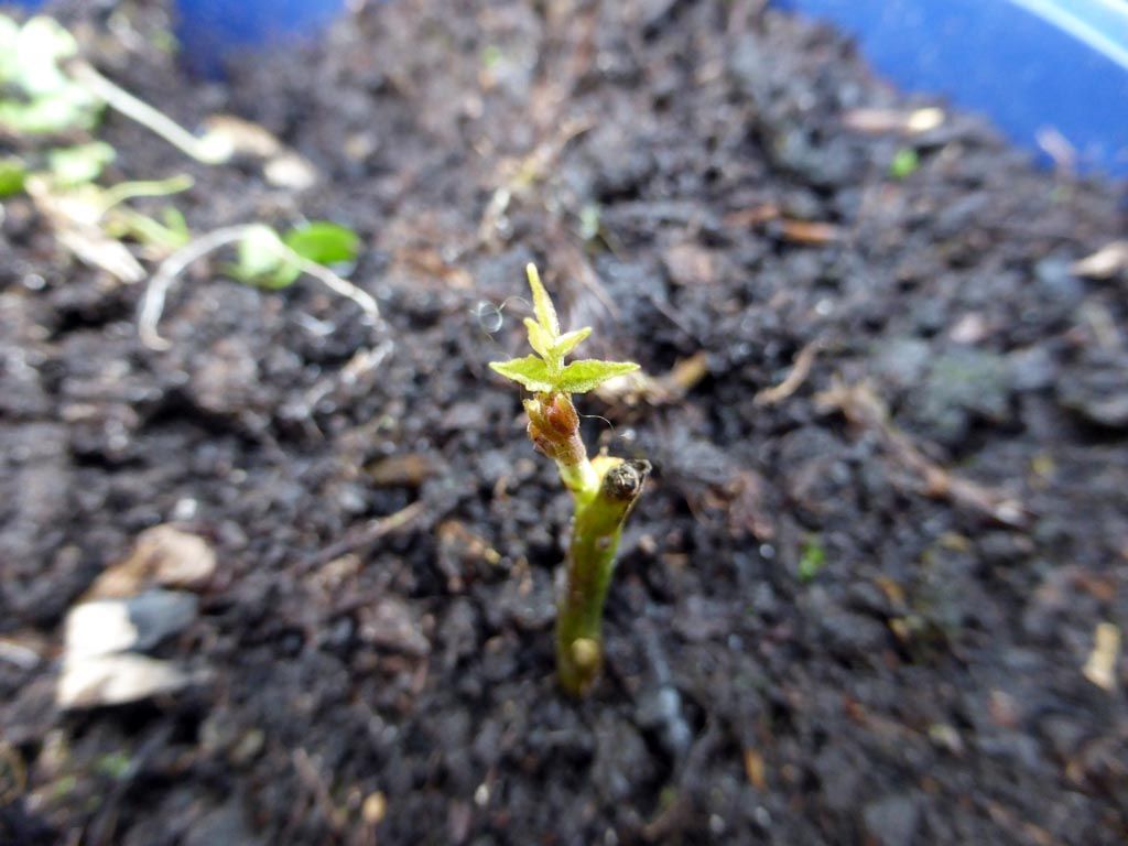 Hier plantte ik drie nootjes en hier kwam er eentje boven. Die pot heeft de hele winter dan weer hier gestaan, dan weer daar, soms veel te nat, dan zette ik hem weer een tijdje onder een afdak en soms dacht ik dat ik hem maar weg moest gooien maar niet gedaan natuurlijk, want wie gooit er nou een notenboom weg.