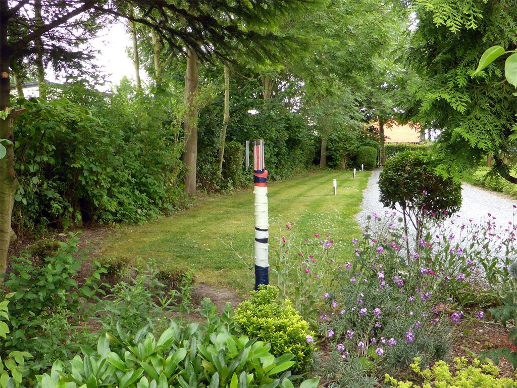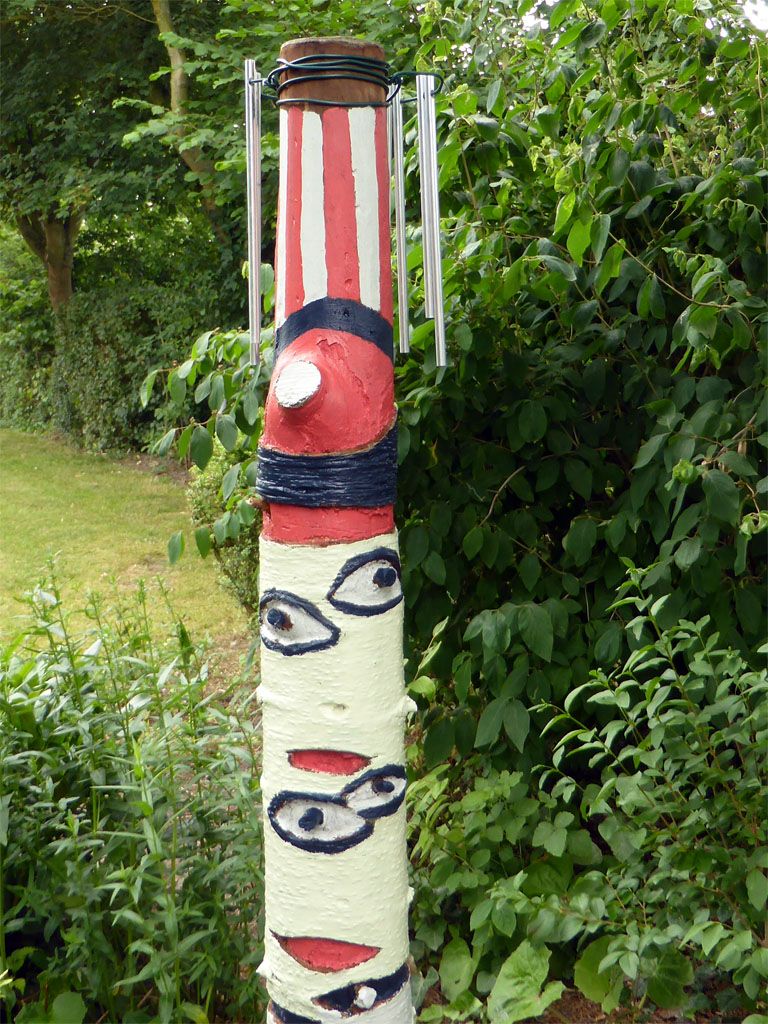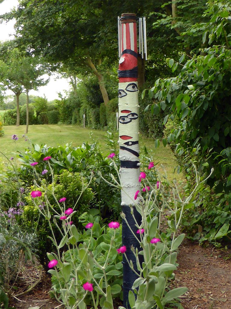 Het stammetje stond al een paar jaar kleurloos te staan en omdat de windgong die ergens anders hing het begeven had besloot ik iets met de staafjes te doen.