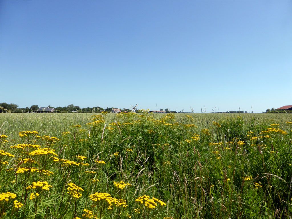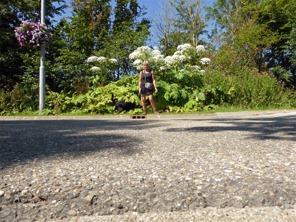 Vanmorgen kwamen ergens een paar grote berenklauwen voorbij. Die staan hier ook, dus ik zette mijn fototoestel op het putje, liep snel naar de andere kant van de weg waar Didi lekker tussen de blaren kroop en wachtte op de piep van de zelfontspanner. Ik zie nog geen vreselijke blaren of blazen, dus het zal wel meevallen.