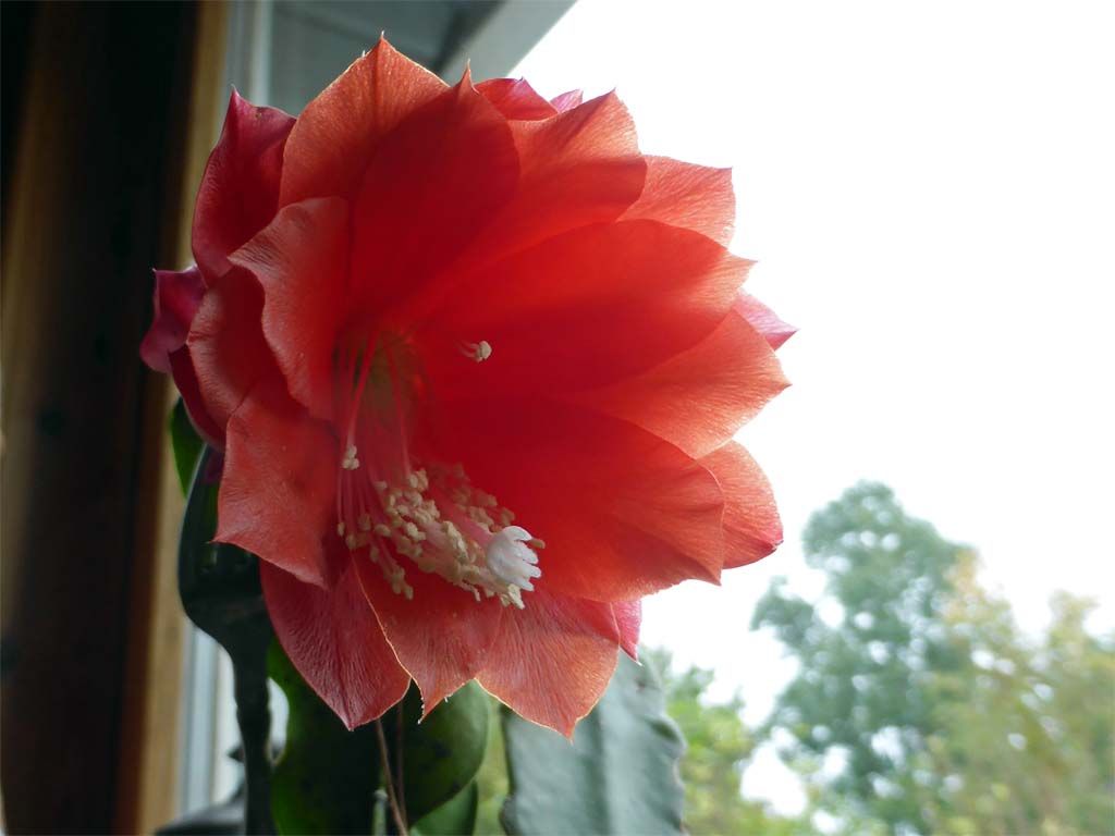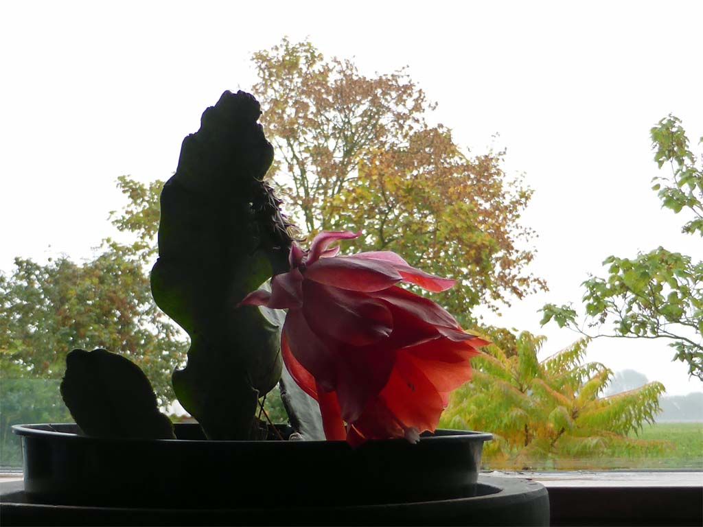 Toen wij een tijdje geleden in Limburg waren kreeg ik van Kees een stekje mee met twee knoppen. Eentje viel er na een tijdje af, maar de grootste hield het vol. Het heeft even geduurd, maar nu hij eenmaal binnen staat gaat hij prachtig open.