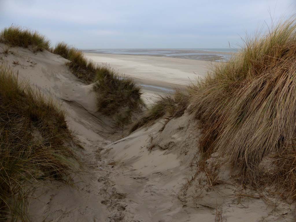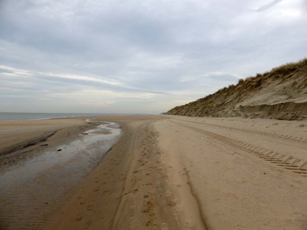 De andere kant op. Het pad stopt bij het Watergat een stukje verderop, waar ze een nieuw strandpaviljoen aan het bouwen zijn en gaat daarna verder aan de bovenkant van de duinen.