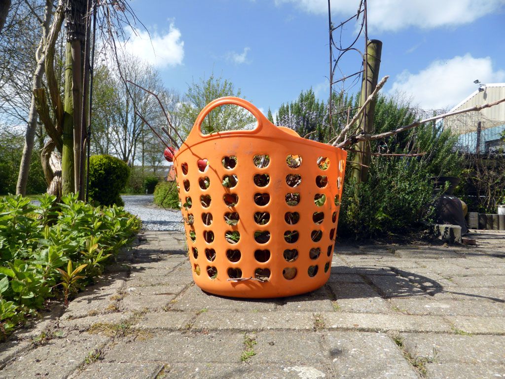Nu ga ik dus 's morgens in de vroegte op pad met mijn mand en een schepje en een harkje om onkruid te verzamlen en alles wat er nog meer voor mijn voeten komt wat ik niet in de tuin wil hebben.
