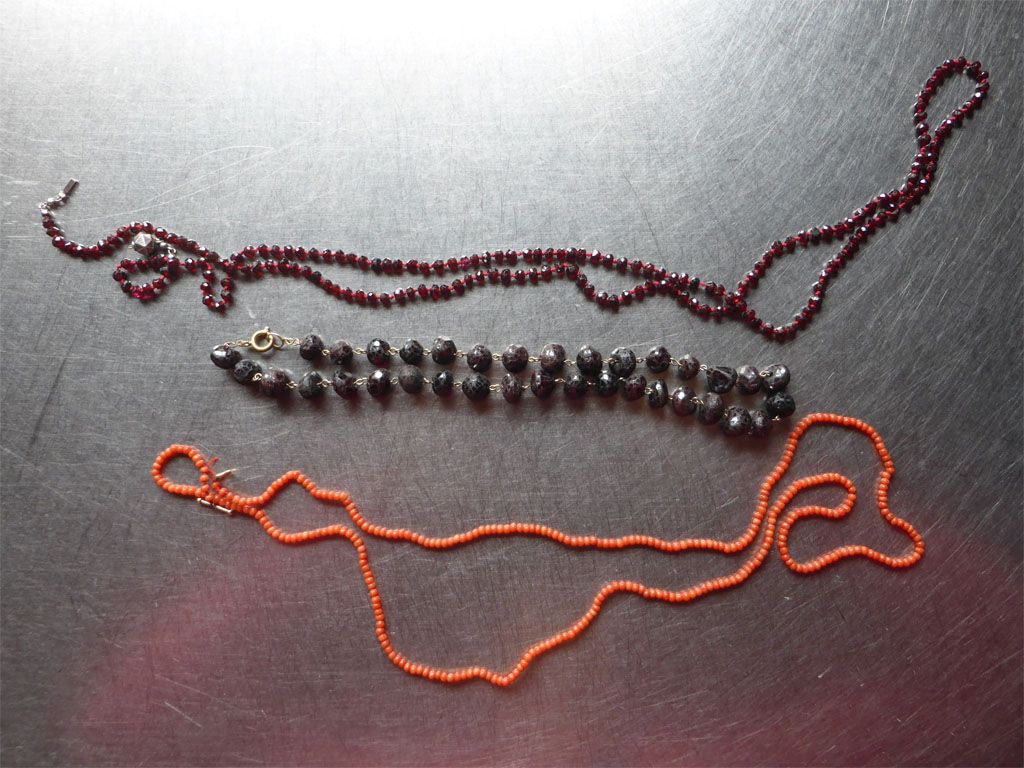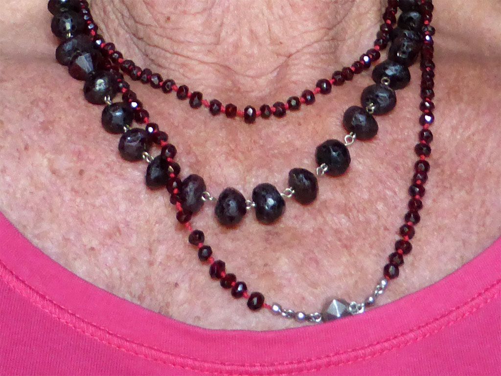 De granaatjes stelde ze voor gewoon te dragen. Ik had de grove aangedaan, omdat ik toch in mijn doosje moest zijn en ze zei dat ik de kleintjes er gewoon bij kon doen, dat maakt het wat nonchalanter, dat is ook wel zo. Zelf lopen ze met ongeveer tien snoeren dik rond hun hals, dat is niets voor mij.