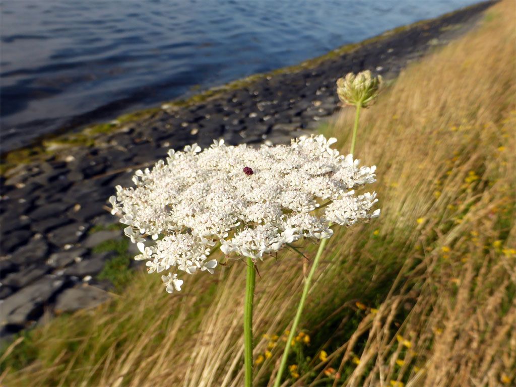 Vanmorgen kwamen ergens een paar grote berenklauwen voorbij. Die staan hier ook, dus ik zette mijn fototoestel op het putje, liep snel naar de andere kant van de weg waar Didi lekker tussen de blaren kroop en wachtte op de piep van de zelfontspanner. Ik zie nog geen vreselijke blaren of blazen, dus het zal wel meevallen.