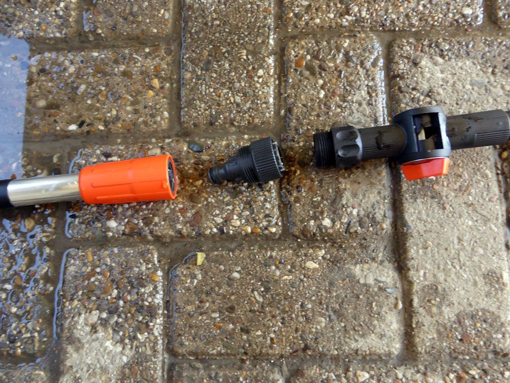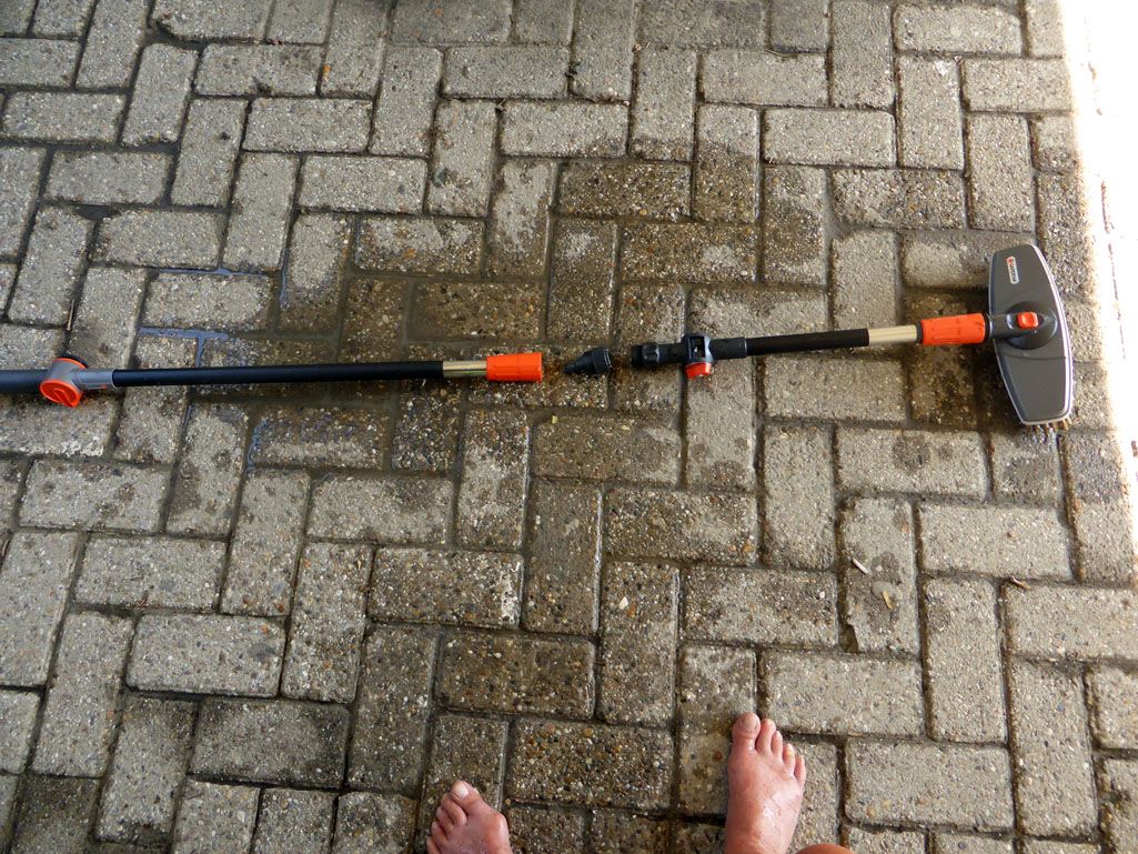 Dus ik naar het tuincentrum voor een nieuwe van Gardena, daar was die andere ook niet van ik weet niet hoe we eraan kwamen, ooit eens gewonnen geloof ik. Ik kocht een steel met borstel en een verlengstuk, maar eenmaal thuis kreeg ik het niet voor elkaar alles in elkaar te passen. Joop erbij gehaald die snapte het ook al niet.
