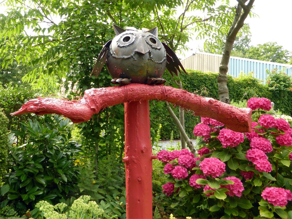 De uil heb ik een stok gegeven om zijn voeten op te laten rusten, dat zit vast veel makkelijker. Gelijk de paal ook nog maar een kleurtje gegeven.
