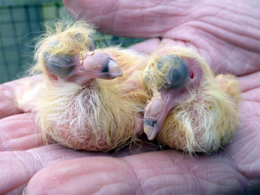 De eerste jonge duiven zijn weer uit hun ei gekropen, wat een mormels zijn het toch.