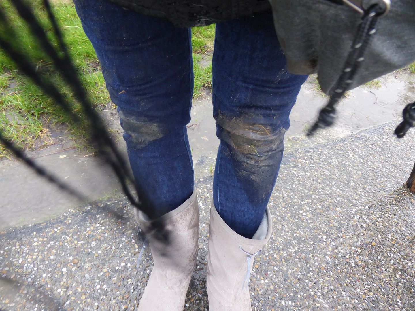 O gezellig, ik sliep ook weinig en ik hoefde niet eens uit te glijden om toch tot boven de knie onder de modder te raken. Maar zie ik nu goed dat je chique witte laarsjes draagt met dit weer? Dat kan nooit lang goedgaan toch?