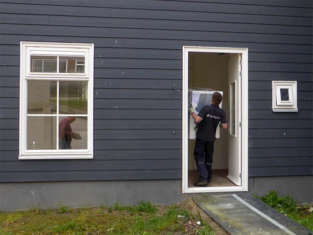 De vrachtwagen kon nog makkelijk twintig meter achteruit, tot aan de voordeur en een steekwagen hadden ze niet zeiden ze met een brede grijs, volgens mij zagen ze het als training, het slepen met de zware dozen
