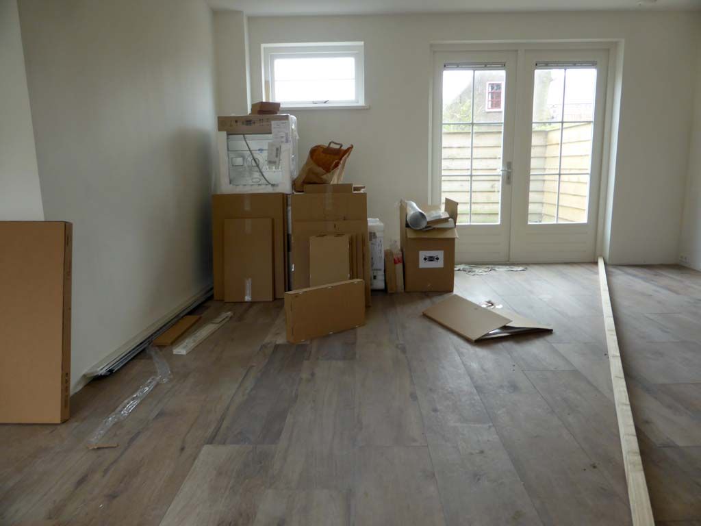 Vandaag kwam de keuken, dus vanmorgen ging ik eerst eens dweilen zodat het ergste stof en cement van de tegels af was. Ik zal blij zijn als aan de achterkant nu ook de tegels liggen, het zand blijft aan je schoenen plakken en dat loop je telkens mee naar binnen.