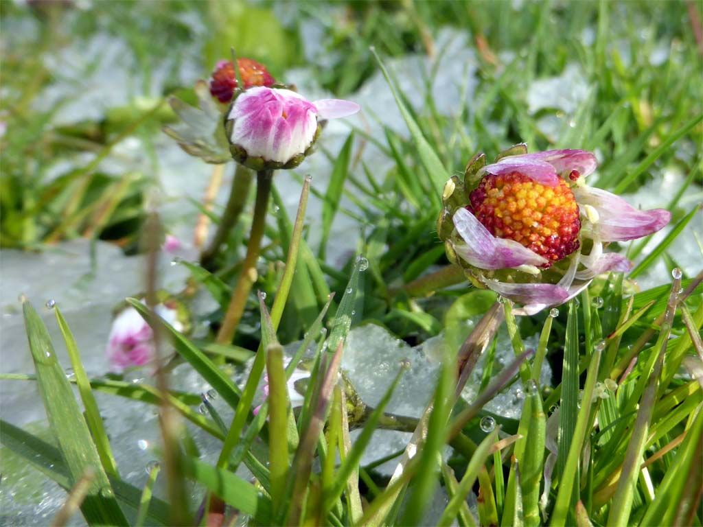 Ijzige madeliefjes in het witte gras vanmorgen.
