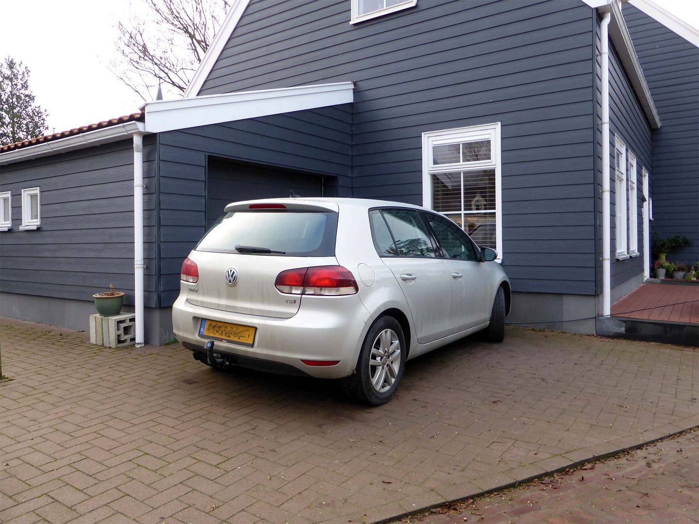 Verder staat hij goed, kleurt mooi bij het huis en oja, Didi kan in de kofferbak, dat is even wennen maar volgens mij vind ze het wel leuk. We zien wel.