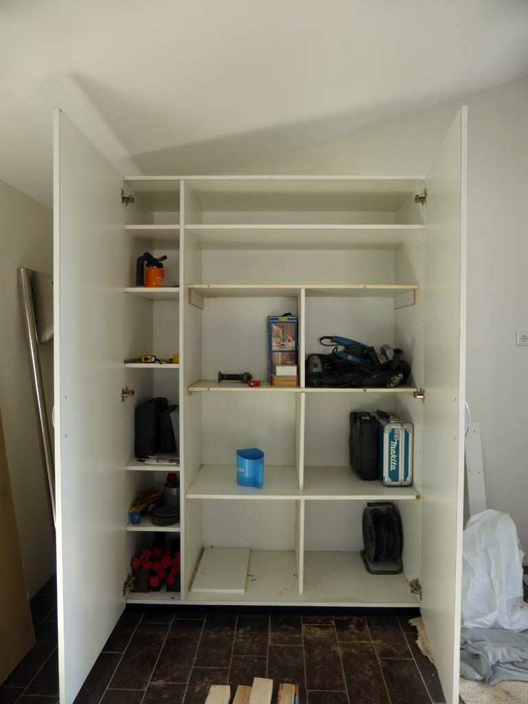 Joop kreeg een loeizware kast bij aankoop van het huis, die heeft hij vanmorgen klaar voor gebruik gemaakt, want daar moet alles in... dat wordt nog passen en meten denk ik, maar dat is met alles zo. Er zijn o0ok nog wel een paar planken gepland, maar toch... ik ben benieuwd.