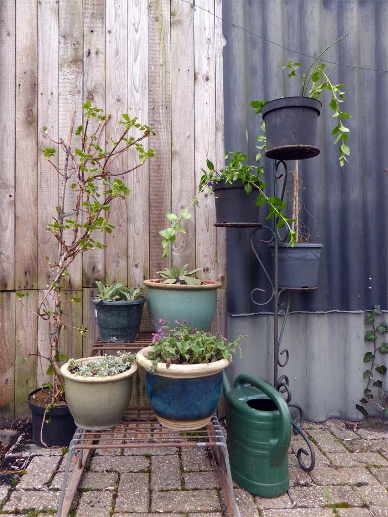 Ik ben vooral hier in de weer en Joop daar. Meestal zo rond deze tijd ben ik bezig dingen neer te zetten, een potje hier een tafeltje daar, nu haal ik vooral weg en veeg en ruim op, het wordt steeds minder mijn tuin, maar dat is juist goed, dat maakt de stap makkelijker en ook het idee dat het aan de kant is is fijn, als ik daar aan de slag moet.