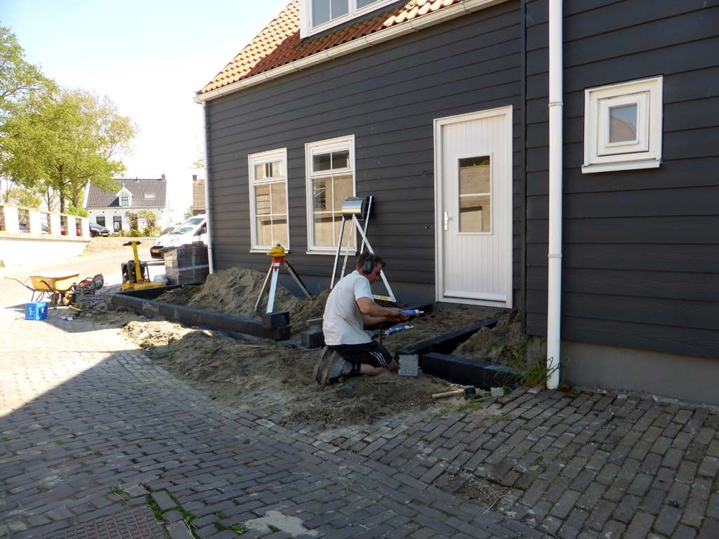 Morgen komen de stratenmakers de boel af maken en Joop monteerde ook nog een stelling met de plankjes in wild verband.