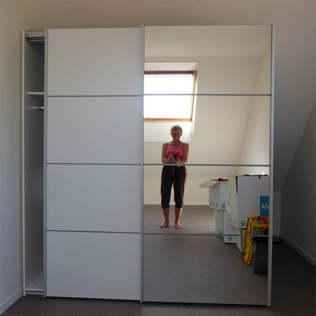 In ons eerste Scharendijkse huis ook zoiets, maar die vermaakten we en hadden we schuifdeuren met bruin bloemetjes behang. in plaats van de originele die bij de Deense woningen hoorden, En hier hebben we ook een kast die bij het huis hoort, een inloopkast, die kan ook niet mee.