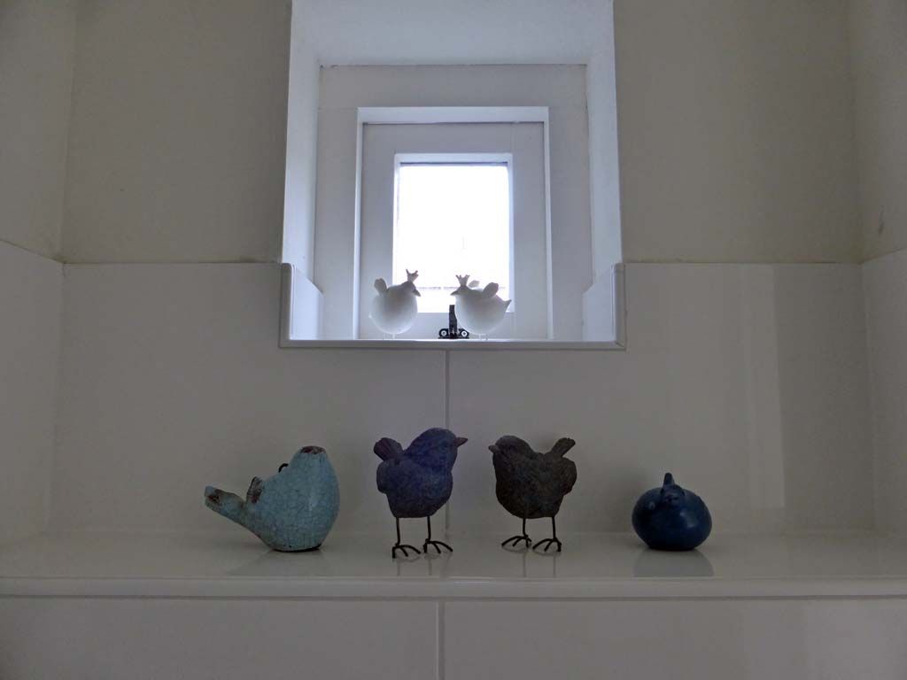Zo gezegd zo gedaan en ik pakte nog wat andere kleine dingen die al door mijn hoofd gegaan waren, nl. de vogeltjes voor de wc. Ik heb daar een leuk randje voor frutsels en de vogels mogen daar. De grote blauwe (ze zijn allemaal blauw) heeft ook nog een ophanghaakje, dus ik denk dat die nog gaat vliegen als het lukt qua #haakjeergensin.