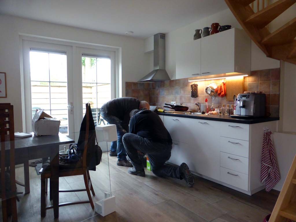 Gelukkig kwamen er twee grote sterke mannen vanmiddag om het laatste stukje in de keuken te tegelen en zij wilden wel even helpen het gevaarte boven te krijgen, dat lukte zonder brokken.