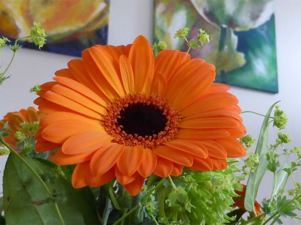 Ik kreeg een bosje oranje Gerbera's van haar, dat past mooi bij het hout dacht ze, niet wetend dat we al verhuisd waren.