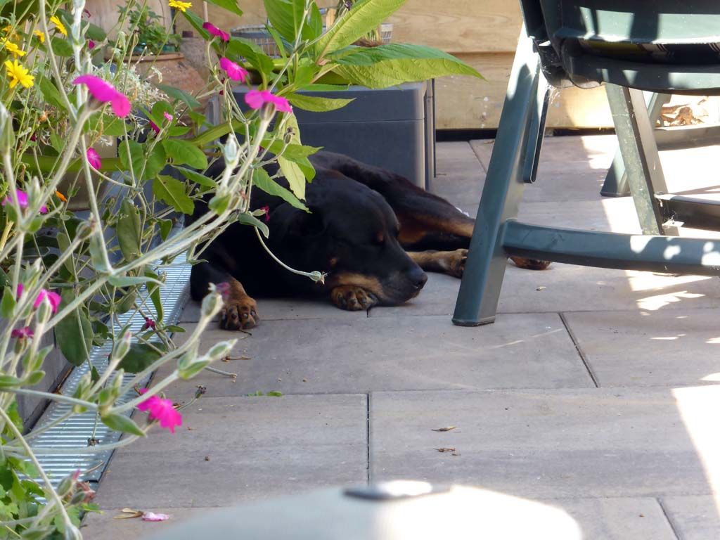 Te warm om te wandelen vonden Didi en ik. Wij scharrelden hier in de tuin, daar kan ik mezelf ook best bezig houden hoor en heerlijk schaduw van de boom. Joop deed wel een rondje.