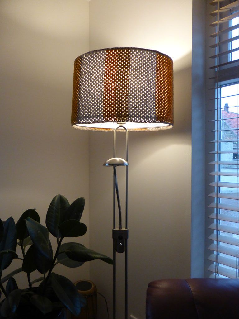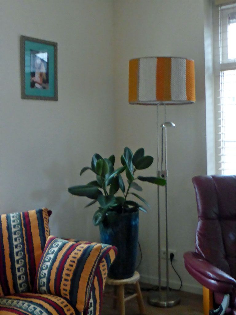 Het was wel een erg saaie witte lampenkap, dus heb ik hem een jasje aangedaan het licht komt toch grotendeels langs de boven en onderkant en het staat veel leuker. Misschien maak ik ook nog wel een andere, kan ik eens afwisselen.