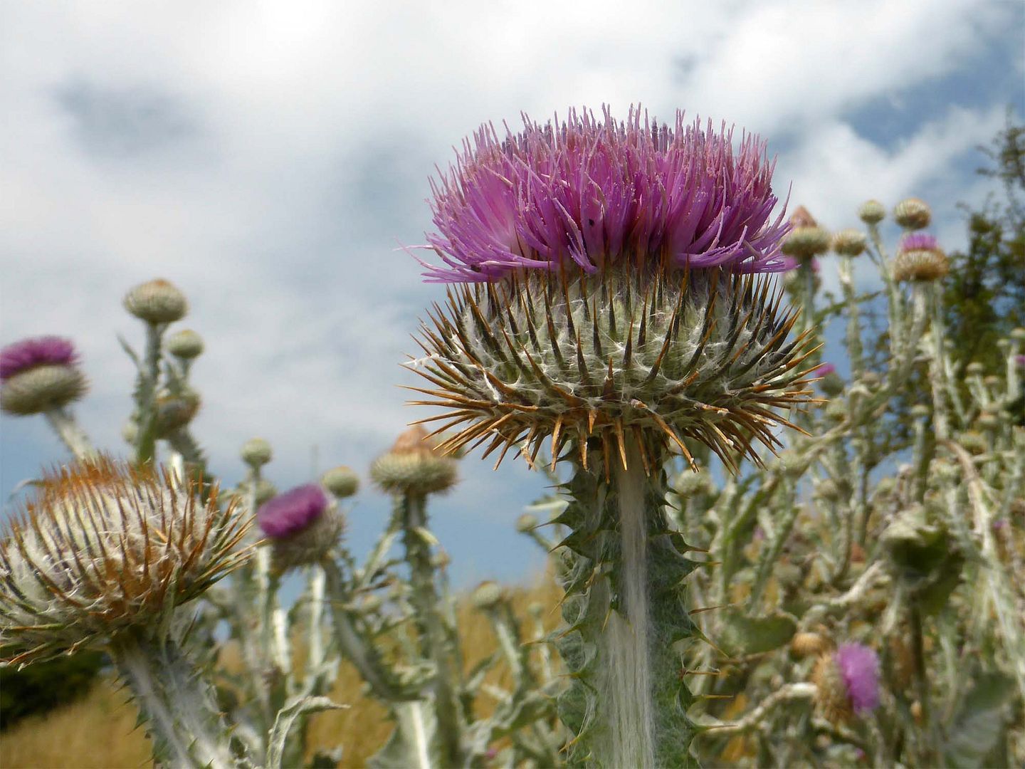 Mooi, die Speerdistel, Ria. Zal wel prikken, maar ja, dát weet je. Ja, warmer hoeft van mij ook niet. Maar goed. je hebt je parasol!