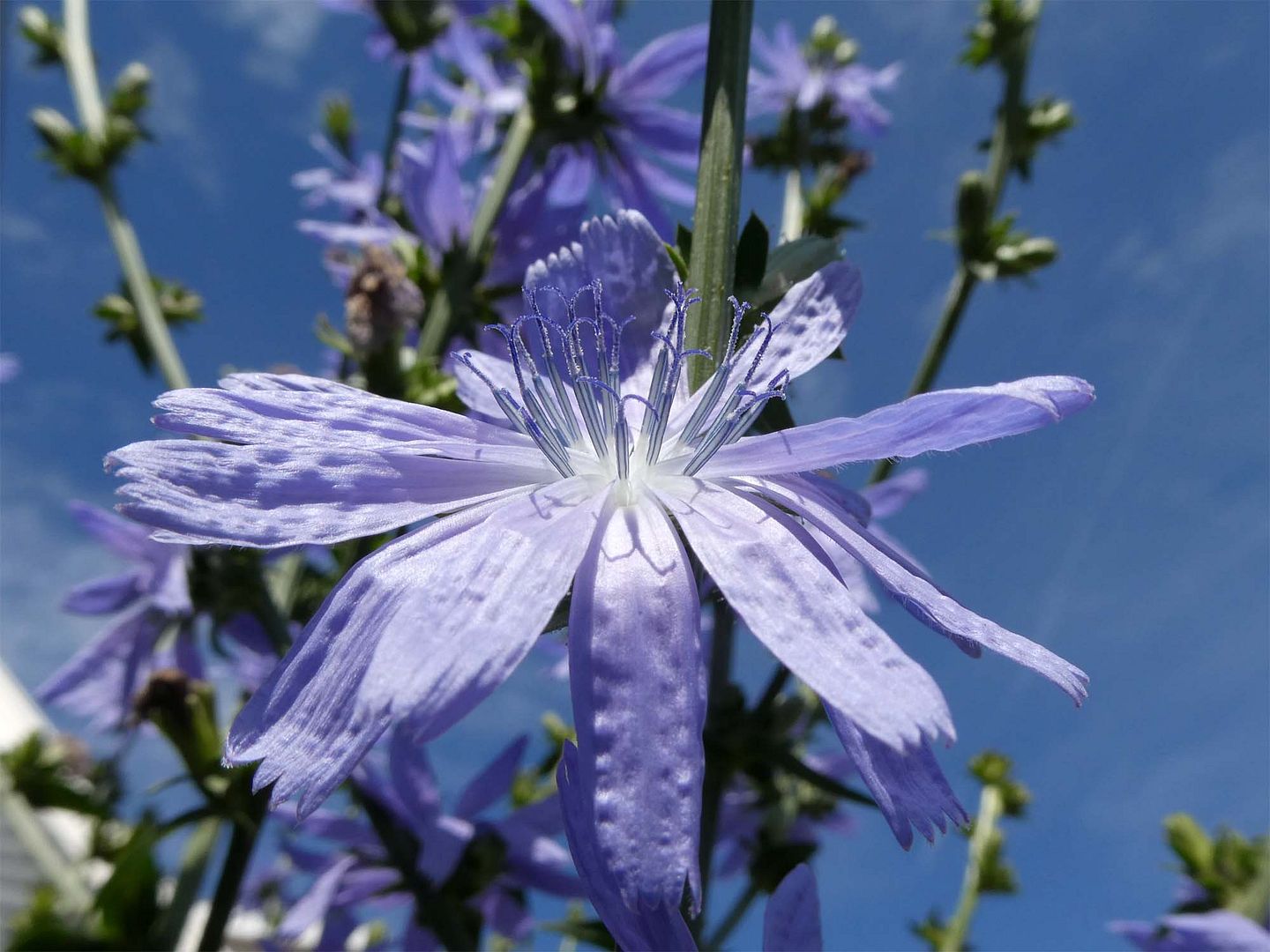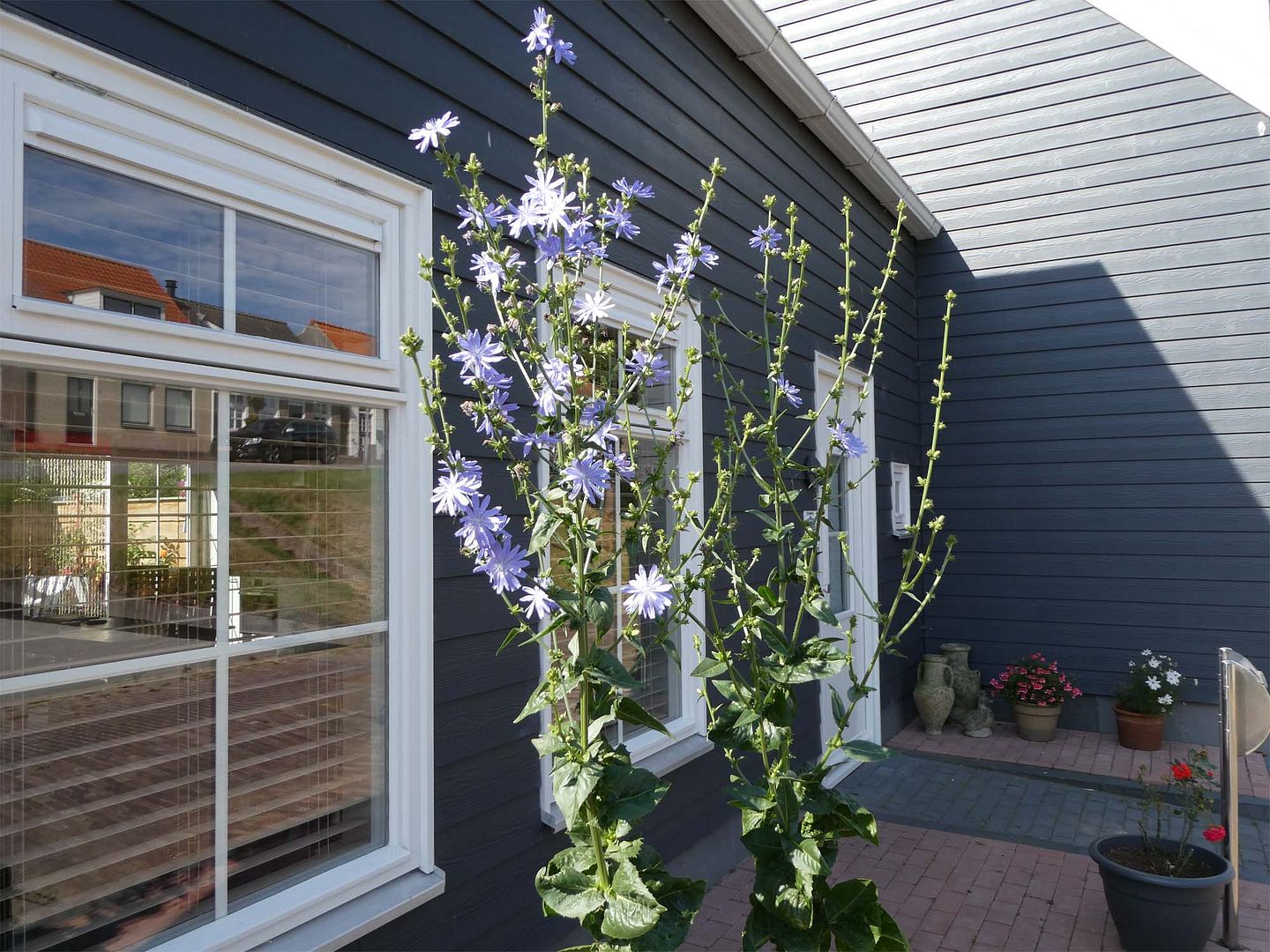 De cichorei, ofwel de witlof bloeit. Ik stopte de stronken afgelopen najaar in de bak en nu bloeien ze prachtig.