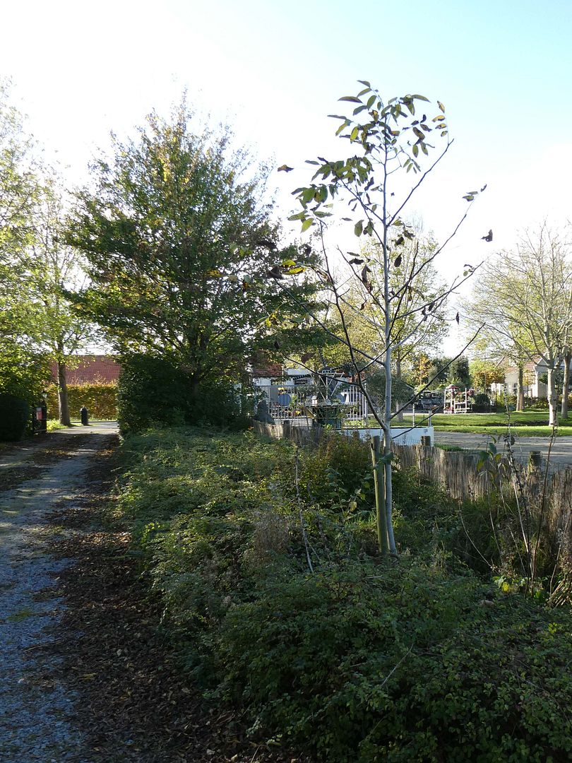 Vanmiddag even om boodschappen op Scharendijke. Het hek bij ons huis stond open en ik kon het niet laten even bij de notenboom te kijken. Geen idee of er noten aan hebben gehangen. In 2012 plantte ik hem op de plek waar hij nog steeds staat, vijf jaar geleden dus en toen bestond hij zeker al twee jaar want ik vond hem met nootje en al.